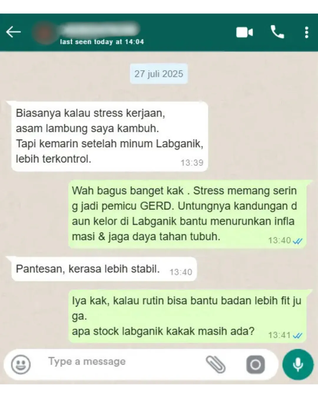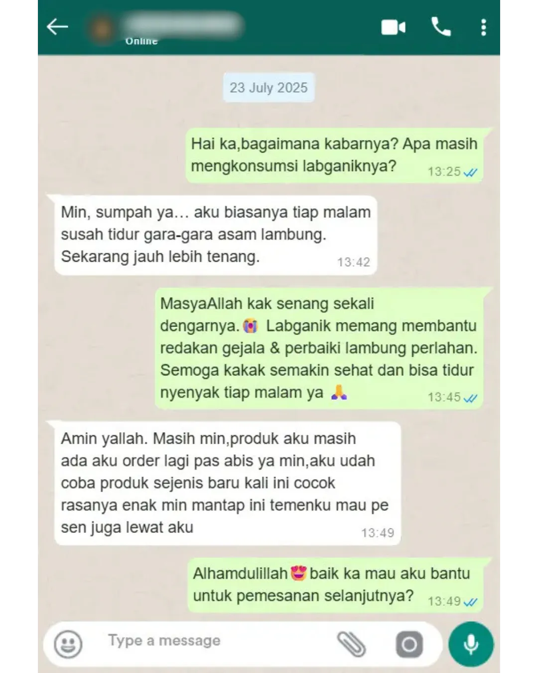 “Aku dulu gampang cemas dan kerjaan numpuk bikin lambung sering nyeri. Awalnya ragu coba Labganik, tapi setelah rutin minum tiap pagi, MasyaAllah lambung jadi tenang, badan lebih ringan, dan pikiran juga lebih fokus. Sekarang malah nggak bisa sehari tanpa Labganik!”